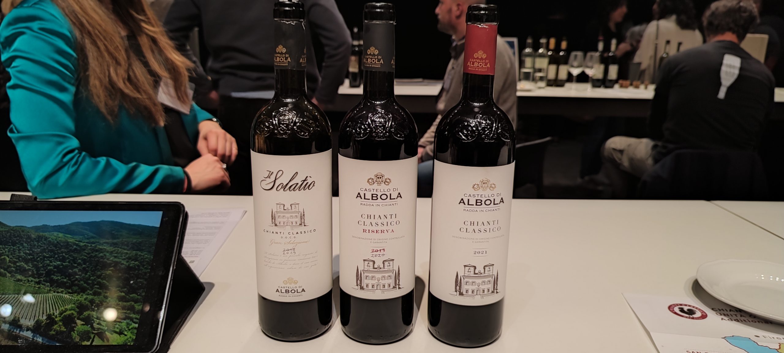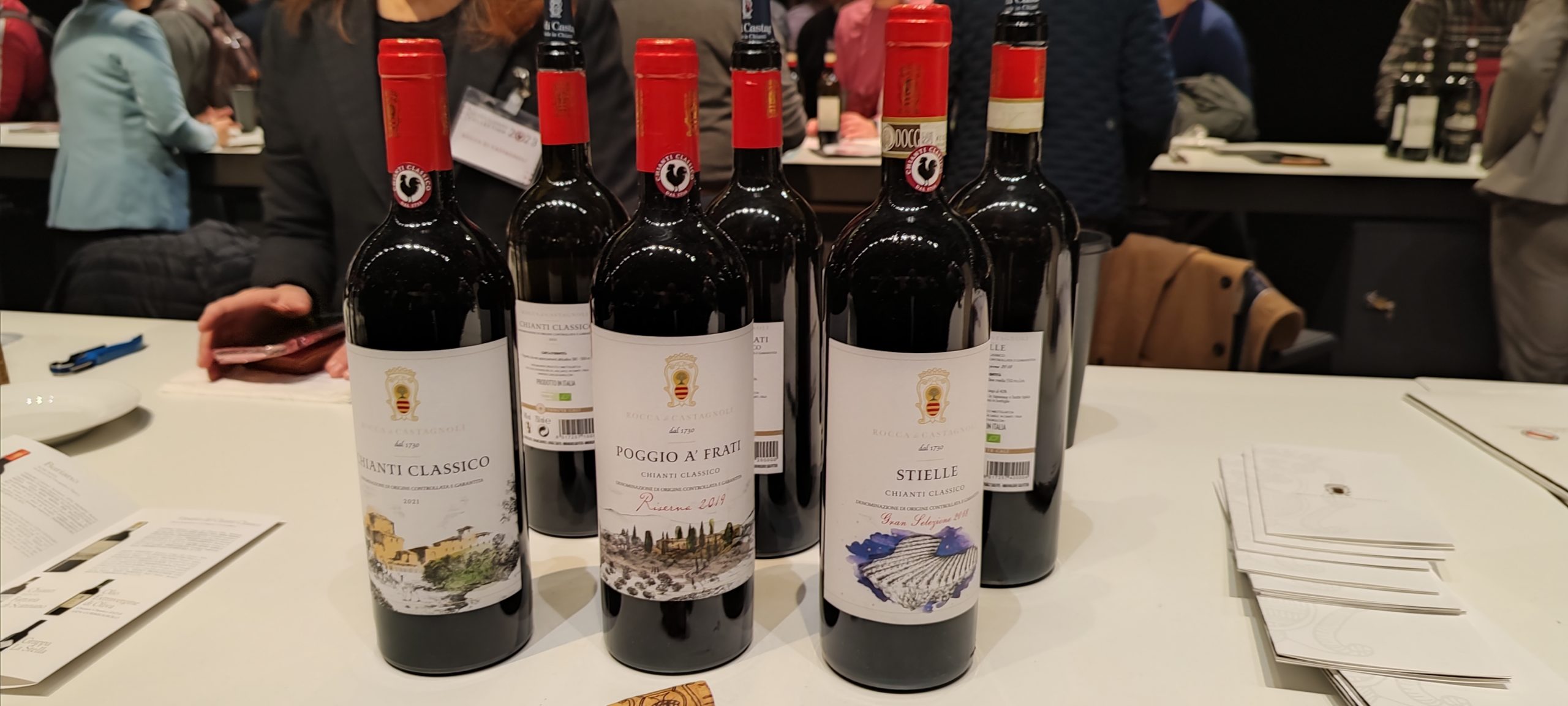 Rocca di Castagnoli ostenta in degustazione Poggio a’ Frati DOCG Riserva 2019, nato da uve Sangiovese e Canaiolo in piccola percentuale generate in terreno calcareo-argilloso. Affinamento lungo 15 mesi nelle botti, cui segue 1 anno di bottiglia, grande complessità, struttura gustativa, eleganza, rosso intenso, profumo intriso da ciliegia, marasca, matura spezie, conferiscono al vino grande charme gustativo, che trova riuscito abbinamento nei formaggi stagionati, zuppe vegetali, carni selvatiche, arrosti. Chianti Classico DOG Gran Selezione 2018, Stielle personifica quel purosangue Sangiovese nato tra terreni contenenti galestro e calcari, esposti a Nord-Sud. Questo nobile vino collinare vanta affinamento lungo 18 mesi, assemblaggio di 4 mesi, 1 anno nella bottiglia. Rosso fruttato e balsamico, Stielle manifesta ampia pienezza, lusinghiera acidità, eleganza generata dagli avvolgenti tannini, nettare ideale per formaggi invecchiati, bistecca autoctona, cacciagione, arrosti. Generato da Sangiovese con intrusioni di Canaiolo e Colorino, complesso, strutturato, Chianti Classico DOCG 2021 evidenzia note fruttate alla ciliegia, freschezza, tannini vivaci, consigliato per arrosti, carni bianche, formaggi a media stagionatura.