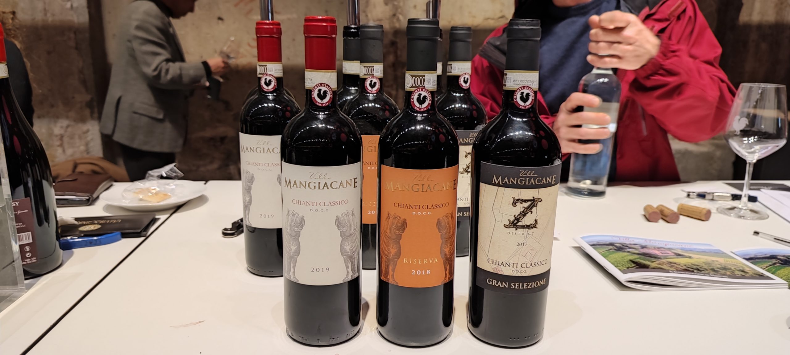 Storica dimora sancascianese, Villa Mangiacane si presenta con Chianti Classico DOCG, nato da vitigni Sangiovese 85%, Canaiolo 10%, Colorino 55%. Fermentazione a circa 27°, macerazione nelle vasche d’acciaio, affinamento in botte per 12 mesi, imbottigliamento lungo gli conferiscono un caratteristico colore rosso rubino. Luminoso, fruttato con intromissioni floreali alla violette e spezie delicate, il nettare possiede freschezza appagante, struttura, tannini molto equilibrati. Chianti Classico Riserva DOCG è un puro Sangiovese fermentato a temperatura di 29°, macerazione in vasca d’acciaio, affinamento lungo due anni nelle barriques, cui seguono 6 mesi di bottiglia. Rosso rubino tendente allo scuro, fragranze intrise di quercia torrefatta, ciliegia adulta, viletta supportano quell’appagante gusto pieno, sviluppato, speziatamente buono. Z District Gran Selezione DOCG possiede eccellente processo produttivo, gusto perseverante alla ciliegia amara intrisa di quercia, ben strutturato, riccamente fasciante, buona acidità, mediamente tannico.