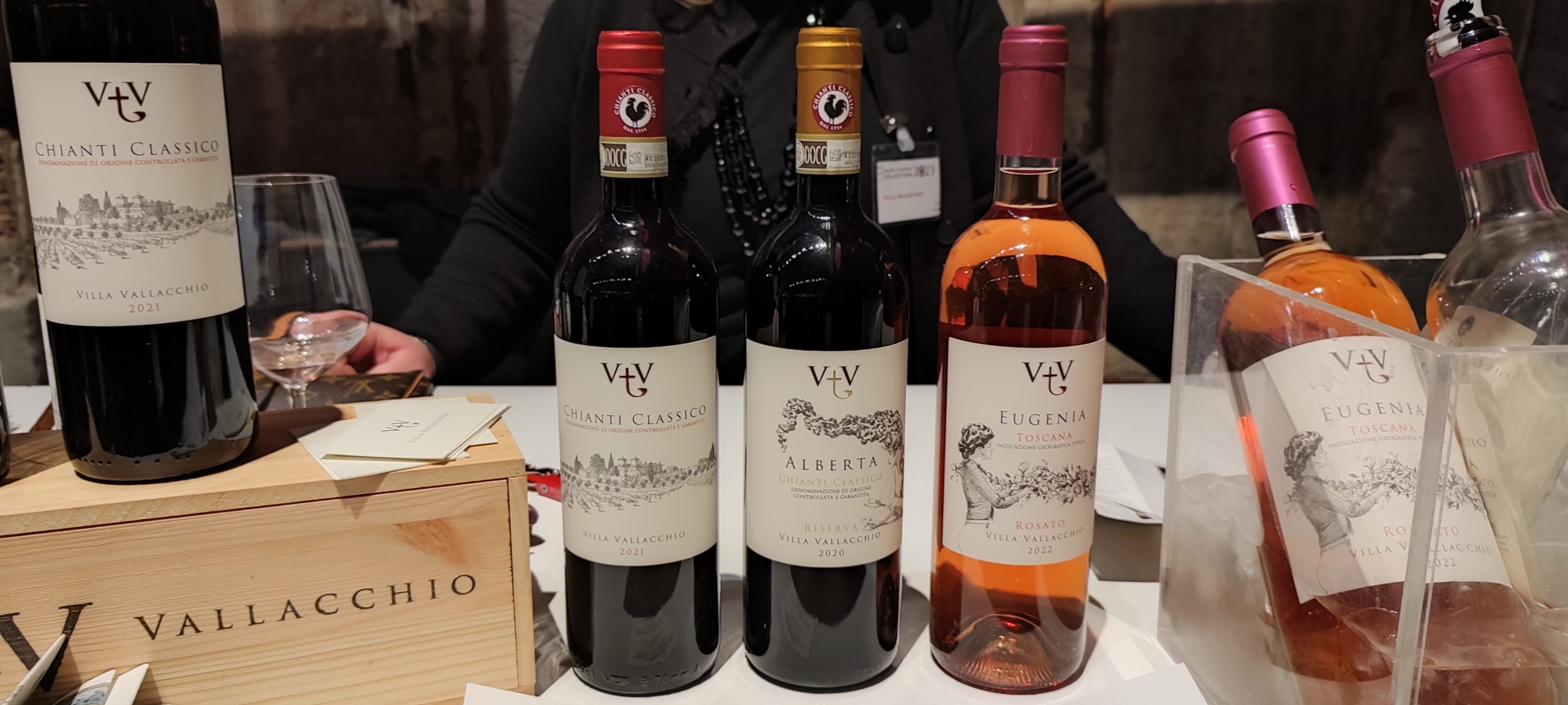 Villa Vallacchio sfoggia Chianti Classico DOCG 2021, Sangiovese 90% con Merlot 10%. Affinamento dai 4 ai 6 mesi in barriques di rovere francese ma anche cemento, permanenza nella bottiglia per 3 mesi ne fanno un gioiello color rosso rubino, profumato di frutta scura e polposa, spezie, viola. Avvolgente, carezzevole, equilibrato al palato, questo vino persistente possiede tannini di buona levatura come la tenuta acida. Chianti Classico DOCG Riserva 2020, Alberta vanta Sangiovese 95% e Merlot 5% affinato in tonneaux di rovere gallico per 10 mesi, cui seguono 6 mesi nel cemento. Profumo avvolgente, terroso, composito, sentori in vaniglia, burro, bacche di ginepro, Alberta ha gusto lungo, elegante, poderoso. Eugenia appartiene ai Rosati Toscana IGT 2022, affinato nell’acciaio, gradevole, consigliato per rimpatriate tra amici.
