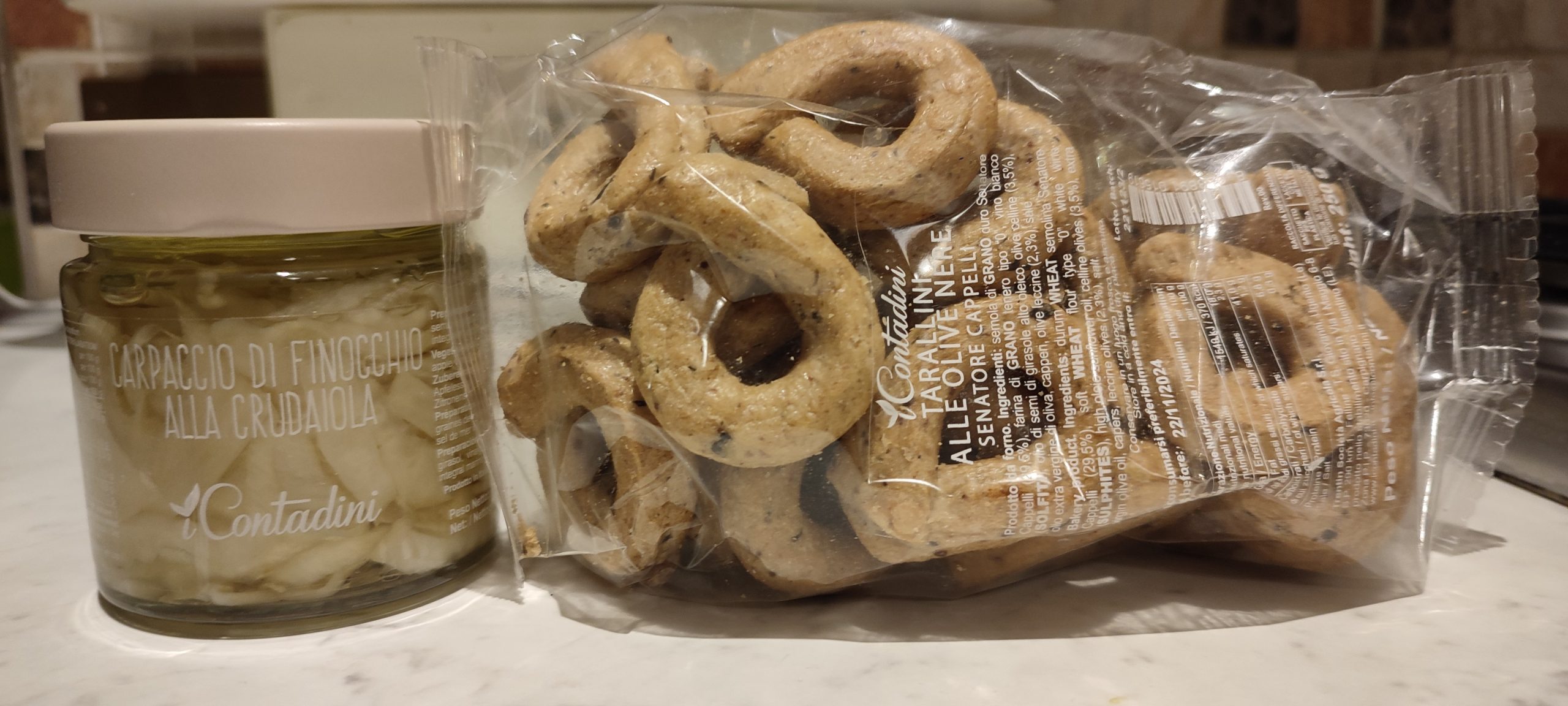 I Contadini emana attaccamento a storia, tradizioni, eccellenze, per quella filiera corta fatta di prodotti freschissimi lavorati e confezionati in loco secondo rigorosi standard preservanti sostenibilità, qualità, gusto, profumi, attraverso la cosiddetta Agricoltura Integrata attenta al ciclo vitale delle piante e quanto madre natura possa offrire stagionalmente. Una produzione variegata vanta pasta e prodotti da forno, passando attraverso sughi, condimenti, conserve, marmellate, olio, vino, birra, come quei Tarallini alle Olive Nere Senatore Cappelli, invitanti, sapore unico, distinguibilità al palato dei selezionati ingredienti, oppure il Carpaccio di Finocchio alla Crudaiola, serafica delizia in pregiato finocchio immerso nell’olio di semi di girasole, olio extra vergine di oliva, aceto di mele, zucchero, sale integrale, succo di limone (www.icontadini.it).