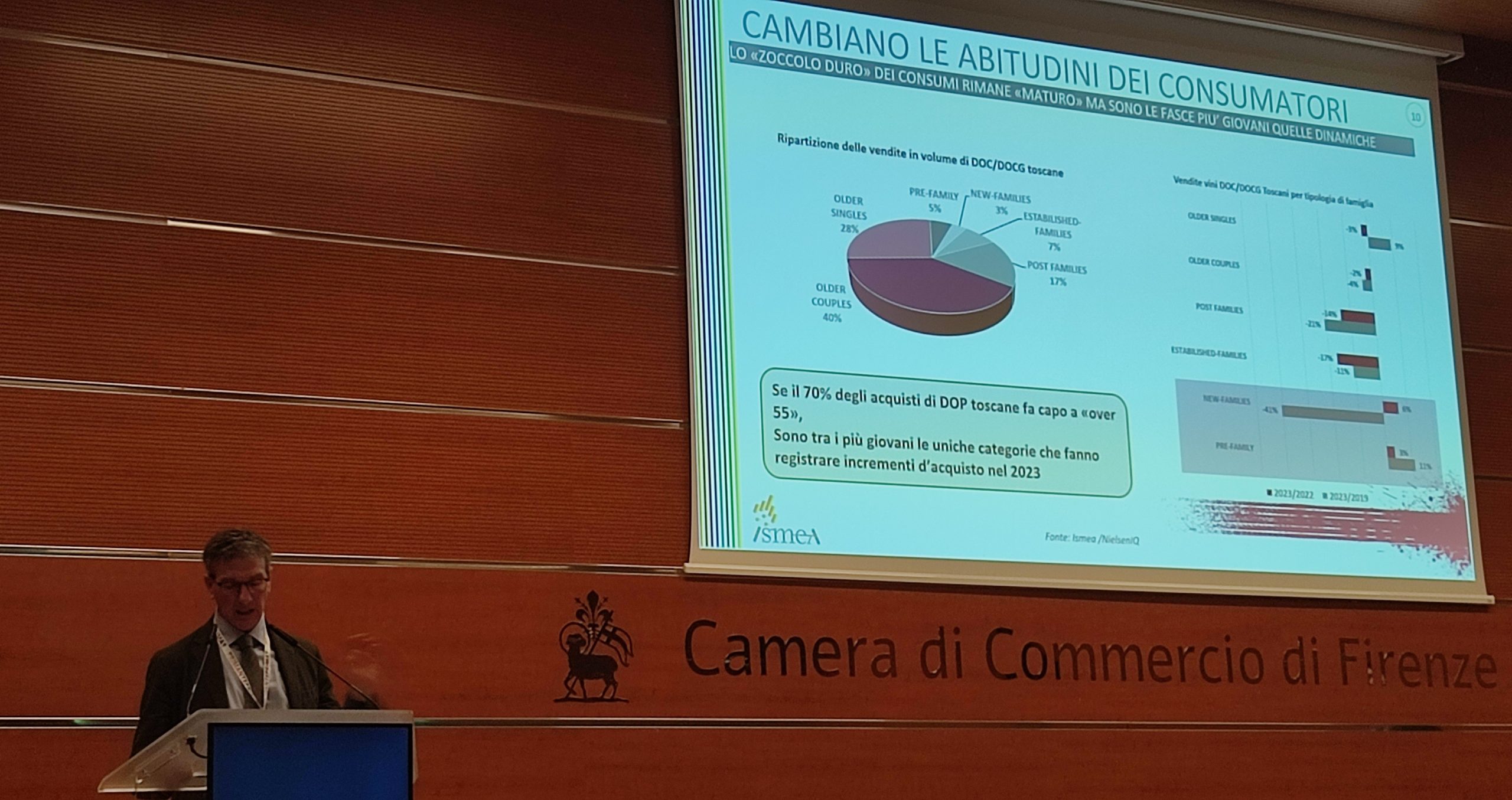 Il vigneto toscano regge coi 61 mila ettari vocati quasi interamente alle denominazioni, contemplanti cinquantotto indicazioni geografiche riconosciute, tra le quali eccellono 41 DOC, 11 DOCG, 36 mila ettari interessati da misura OCM Vino – Ristrutturazione e Riconversione, non a caso il 55% della superficie vitata non supera i venti anni, podio condiviso con il biologico al 38%. Un 2023 caratterizzato da avverse condizioni climatiche, perdita quantitativa, ma lusinghiera qualità, fa sperare nella ripresa delle esportazioni internazionali, dato sottolineato in conferenza stampa da Eugenio Giani, Presidente Giunta Regionale, insieme a Stefania Saccardi, vicepresidente e assessora all’agroalimentare, che ne sottolinea investimenti ambientali-ristrutturativi oltre la media nazionale, rafforzandone in termini qualitativi la produzione toscana, i cui consumi italici evidenziano una crescita tra giovani prefamily, rimonta delle famiglie con figli piccoli, conferma tra agiati ultrasessantenni del Centro Nord.